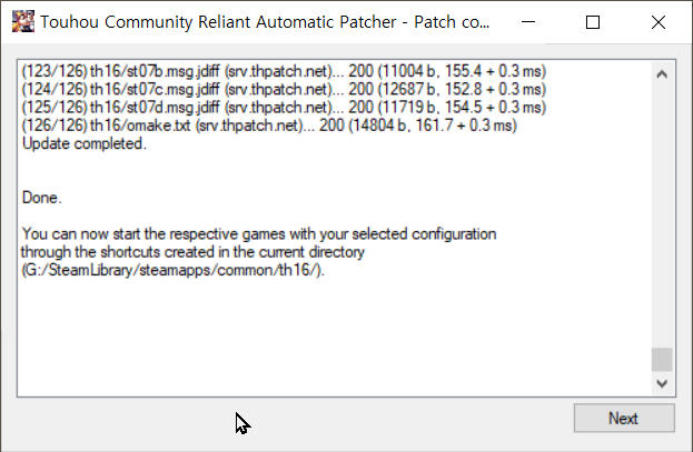 게임이 설치된 경로에 압축을 풀었다면 th16 폴더가 이미 선택되어 있을 것 같네요. 확인해보고 그냥 확인을 눌러도 되겠습니다.