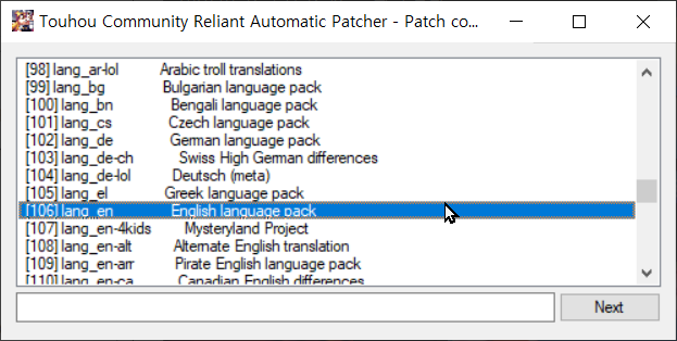 패치 선택 단계에서는 목록을 보고 가장 잘 읽을 수 있는 언어를 가장 마지막에 선택합니다. 저는 영어와 한글을 읽을 수 있으므로 영어(lang_en)-한국어(lang_ko) 순으로 선택했습니다. 번호는 달라질 수 있겠지만 109, 140 순이더군요. 확인해보시고 선택하시길 바랍니다.