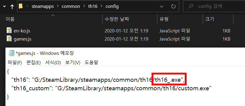 게임의 설치된 폴더에서, config 폴더 아래의 games.js를 열어 th16.exe 부분을 th16_.exe 로 변경하고 저장합니다.