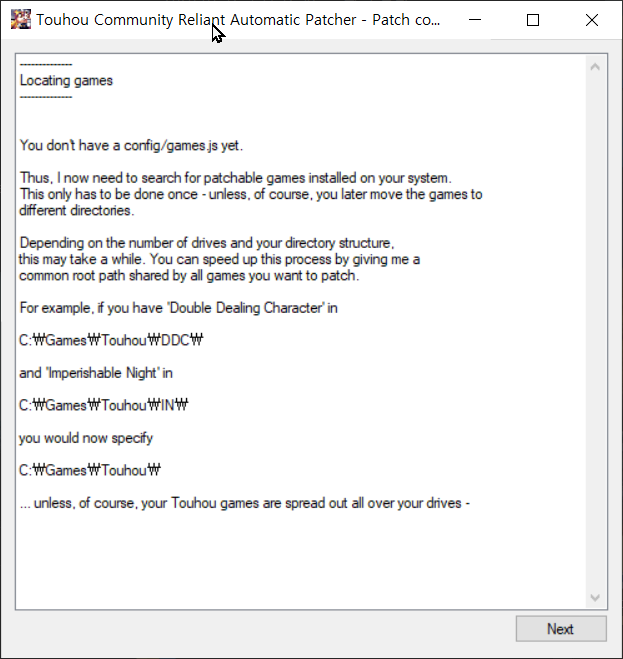 설정 프로그램이 설치된 동방 게임을 찾을 겁니다. 엔터를 누르면 폴더 찾아보기가 열리는데, 게임이 설치된 경로를 선택하시면 됩니다. 설치해놓은 동방이 여러개인 경우 상위 폴더를 고르면 알아서 검색합니다.