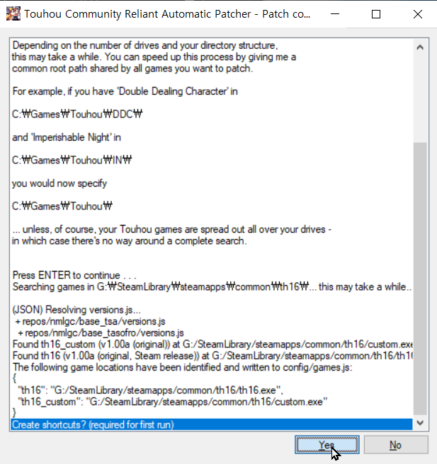다음으로 Create shortcuts? 라는 내용이 나옵니다. Yes를 누르면 게임을 바로 실행할 수 있는 번역된 게임을 실행하는 바로가기가 생성됩니다.
