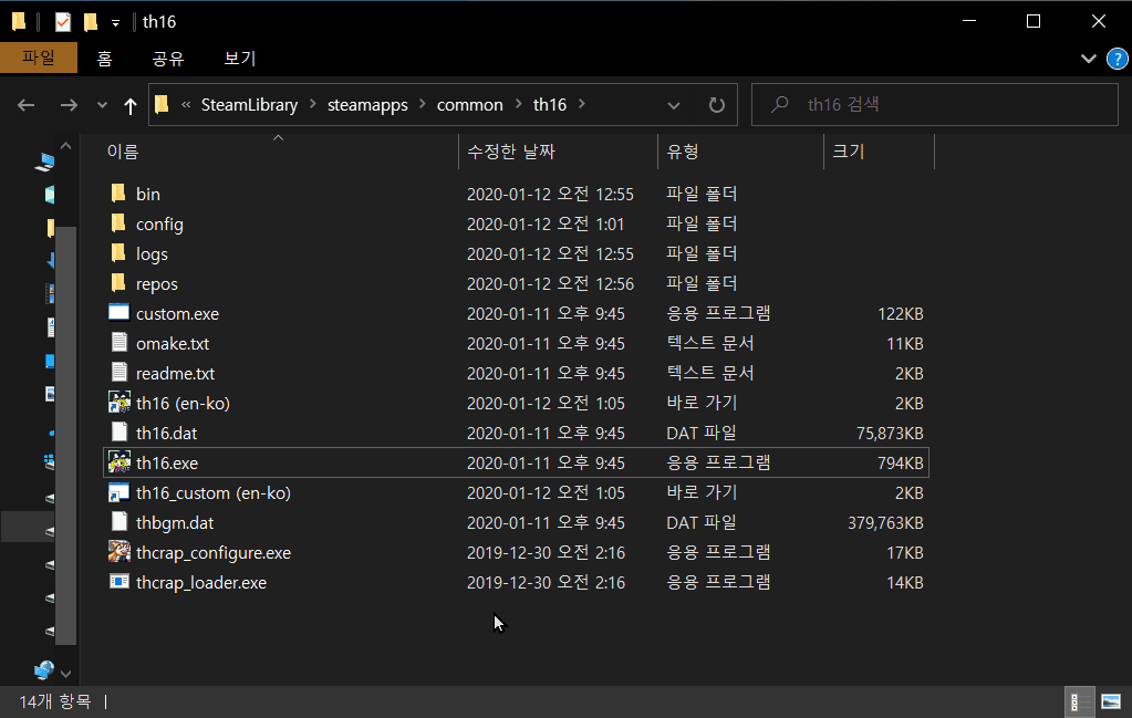 스팀에서 실행하려면 먼저 th16.exe를 적당한 이름으로 바꿉니다. 저는 th16_.exe 로 바꿨습니다. (CD판 유저는 해당없습니다.)