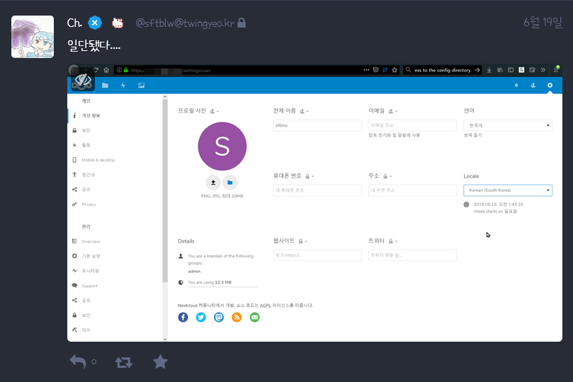 PHP 연관 모듈 같은 거 때문에 고생 좀 깨나 했습니다. x86-64 쓰시는 분들은 부디 Docker로 설치하시길 권해드립니다. 전 armhf라 (orz) 그거 말고도 webdav로 (512MB가 아니라 - 그건 진작에 수정했죠) 1GB 이상 파일이 전송 안 된다던가 하는 문제도 있었습니다. 원인은 리버스 프록시인 nginx의 임시 폴더 크기가 1GB더군요...