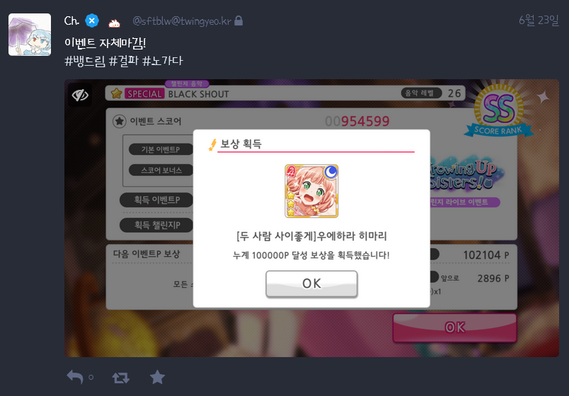 오랜만에 뱅드림 이벤트를 제 때에 맞춰서 자체마감했습니다.