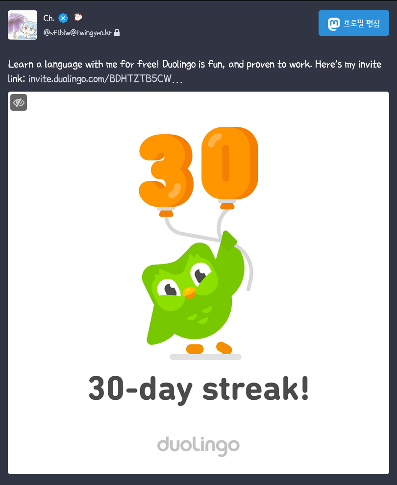 - 21주차: 듀오링고 에스페란토(인공 언어) 연속 학습 30일 돌파!