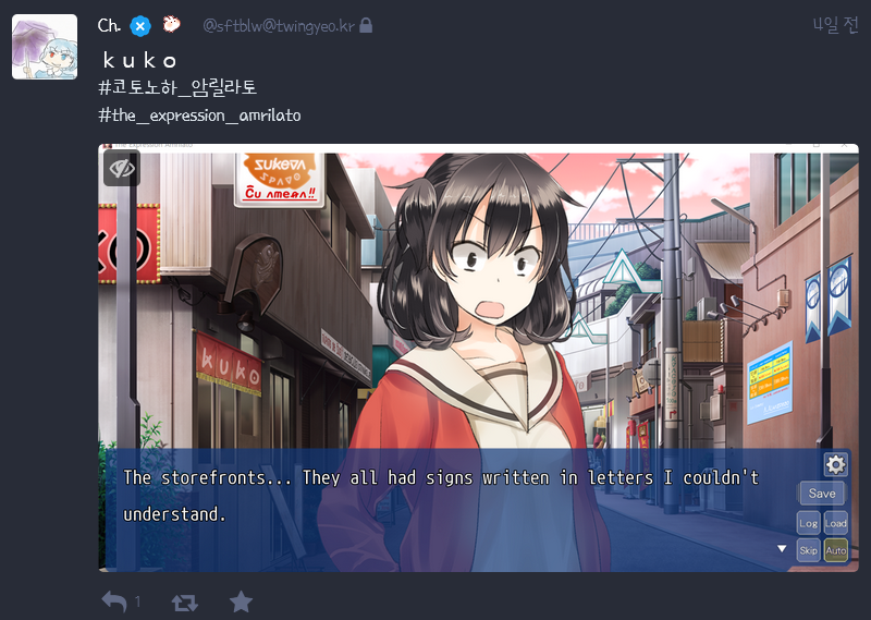 30일쯤 찍었는데 코토노하 암릴라토라는 게임이 스팀에 나왔대요. 플레이하는 거 SNS에 올라오는 거 보는데 재밌어보이는거야... 결국 질렀습니다. (옆집 qdon.space 오너께서 에스페란토 잘 하시는 분이셔서...)
