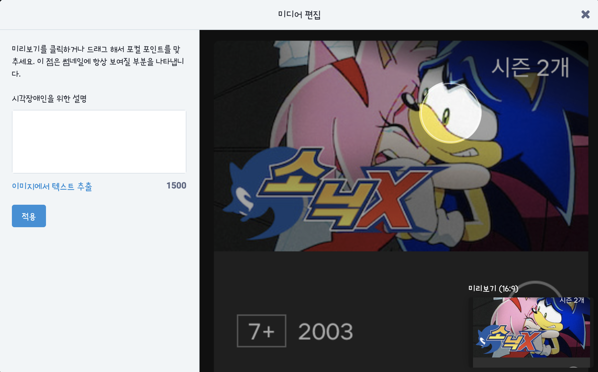 - 썸네일에서 주로 보여줄 위치를 지정할 수 있음 (캐릭터의 얼굴을 반드시 보여준다던가)
