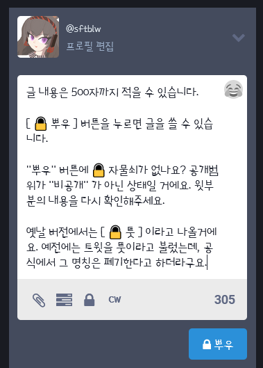 - 옛날 버전에는 [ 🔒 툿 ] 이라고 나올겁니다. (ㅌㅜㅅ, toot)