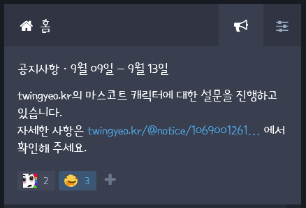 남이 쓴 글에 에모지로 반응을 다는 "에모지 리액션"은 아직은 공지사항에서만 가능합니다. (마스토돈과 호환되는 플레로마, 미스키에서는 가능) 나중에 추가되겠죠...?