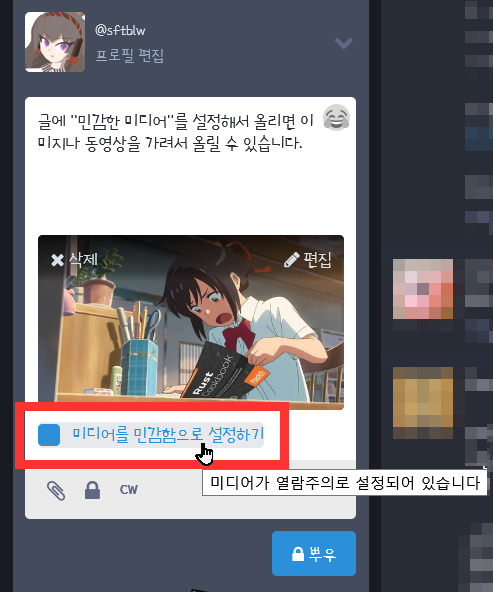 - 민감한 미디어 : 이미지나 동영상을 올린 뒤, 미디어를 민감함으로 설정에 체크한 채로 글을 쓰면 이미지나 동영상이 가려진 채로 나타납니다.
