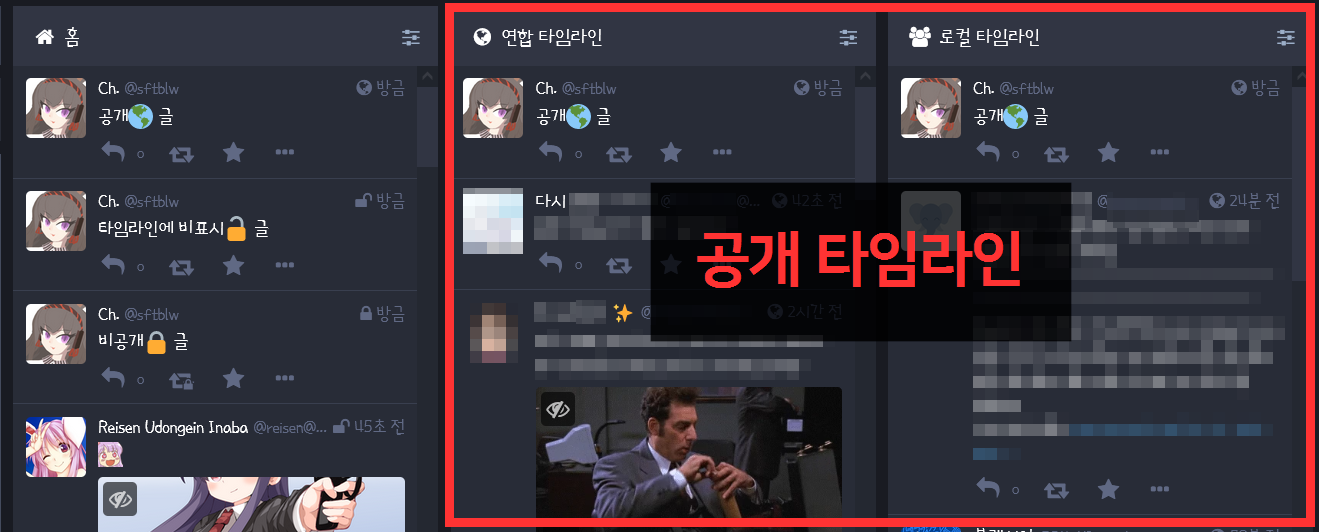 - 내가 서버 전역에 "나 여기있어요" 하고 외치는 글을 쓰는 실수를 하지 않았는지 보려면 "로컬 타임라인" 혹은 사람이 셋 있는 아이콘을 클릭해볼 것