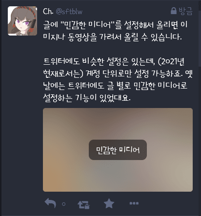 - 민감한 미디어 : 이미지나 동영상을 올린 뒤, 미디어를 민감함으로 설정에 체크한 채로 글을 쓰면 이미지나 동영상이 가려진 채로 나타납니다.