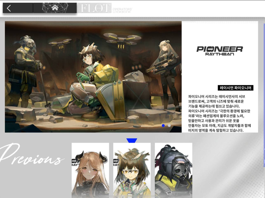 심지어 캐릭터들의 스킨은 해당 세계관의 패션 브랜드에서 나온 상품이라는 컨셉으로, 멋들어진 브랜드 로고와 브랜드와 어울리는 복장의 스킨을 보는 것도 재미입니다. 단적인 예로, "제시카" 라는 캐릭터는 겁이 많은? 캐릭터로, 발매된 스킨 중 하나는 꽁꽁 싸맸는데, "레이시언 공업"의 "파이오니어" 브랜드로 나온 전신 방어 장구입니다.