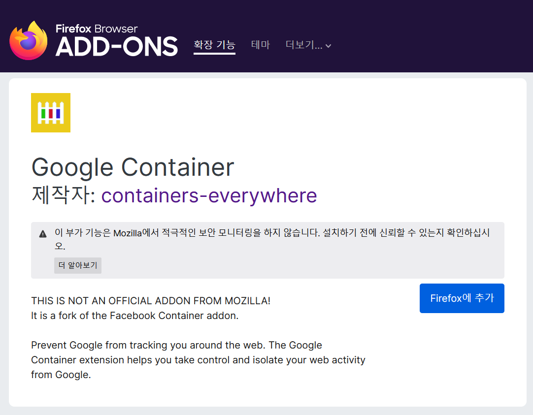 컨테이너 같은 확장기능은 https://addons.mozilla.org 같은 파이어폭스가 제공하는 사이트에서는 동작하지 않도록 막혀있습니다. 사유는... 충분히 추론 가능하시죠? 특정 확장기능이 무해한지 아닌지 알 수 없기 때문일 겁니다. 사용자는 확장기능 A를 설치했는데, 어떤 확장기능이 엉뚱한 다른 확장기능을 설치하도록 가로챌 수만 있어도 굉장히 위험한 상황이 발생하겠죠.
