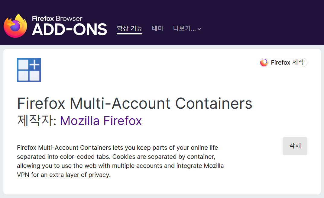 공식 "다중계정" 컨테이너 확장기능을 설정하면 내 입맛에 맞게 컨테이너를 만들고 삭제할 수 있습니다.