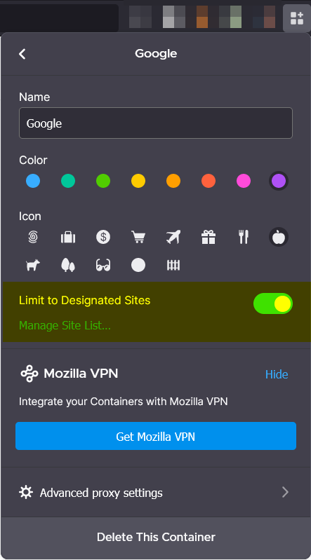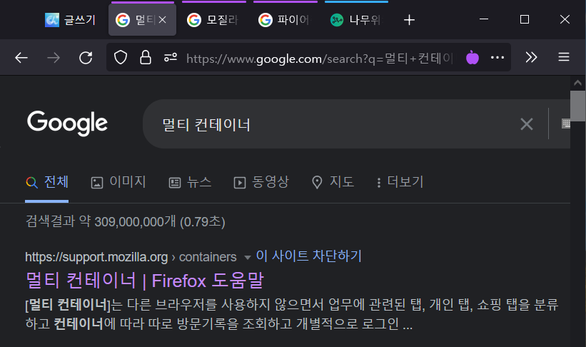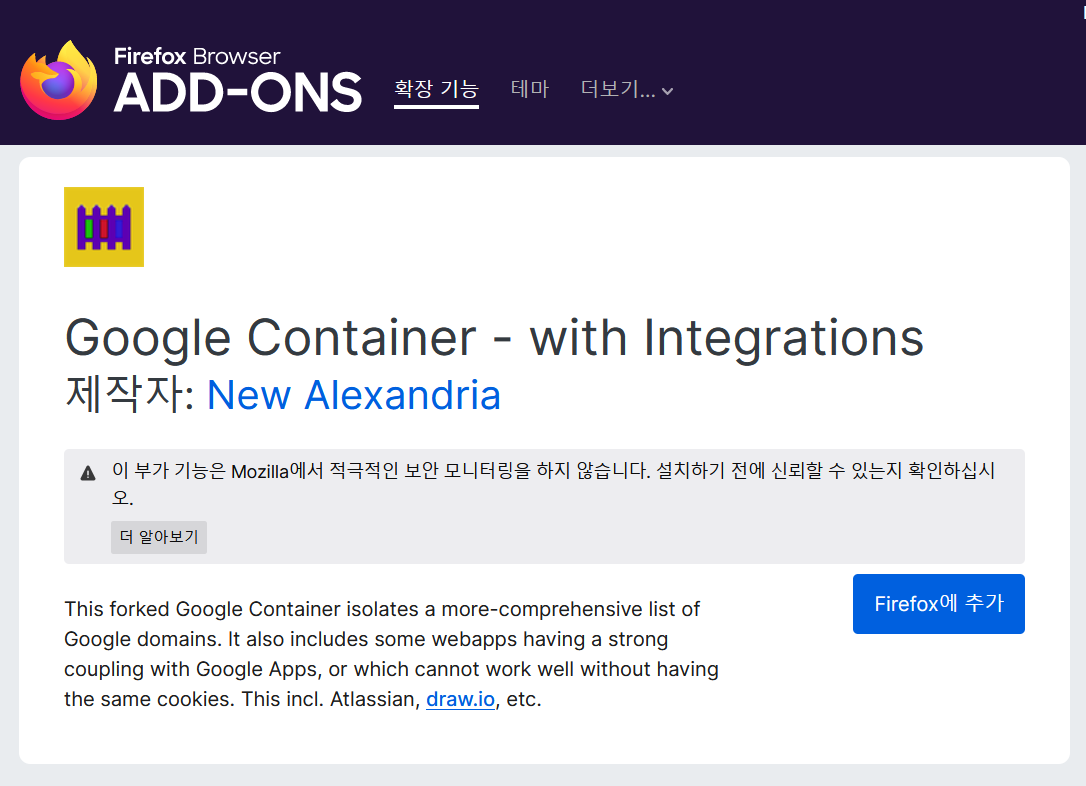 컨테이너 탭 자체는 Firefox의 내장 기능이지만, 탭이 열렸을 때 컨테이너를 바꿔주는 등의 기능은 확장기능이 하는 일이라서 Google 전용 탭에서 Firefox 확장기능 사이트를 열었는데 여전히 Google 전용 탭이네? 하는 일도 가능합니다. 이건 정상이니까 걱정하지 않으셔도 됩니다.