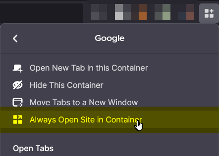 • 항상 이 컨테이너에서 이 사이트 열기 ("Always Open Site in Container")