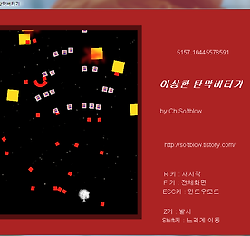 버티기 썸네일형 리스트형 Construct 로 만든 이상한 탄막 버티기 (?) 국내에는 Game Maker 8 을 불법으로 한글화하고 크랙하여 게임을 만드는 카페밖에 없더군요. 그래도 게임을 만들어 보고 싶기는 한지라, 예전부터 잘 알고있던 "Alternativeto.net"에 방문했습니다. 아니나다를까, 오픈소스로 만들어지고 있는 Scirra 팀 (Scirra.com)의 Construct 라는 게임 제작툴을 찾았습니다. 그래서 튜토리얼 조금 보고, 바로 만들고팠던 탄막게임을 만들어봤죠. 물론 대강대강... 이다 보니까 몹 종류도 노란색 사각형 한개뿐이고, 탄환 종류도 한가지(?) 입니다. 목숨도 한개이고, 폭탄따위 없습니다. 레벨업도 없습니다. 그냥 버텨보세요 키는 화살표, Shift와 Z 키까지는 동방프로젝트의 키를 따랐습니다. 동방프로젝트와 마찬가지로, Shift를 누르면 피.. 더보기 이전 1 다음